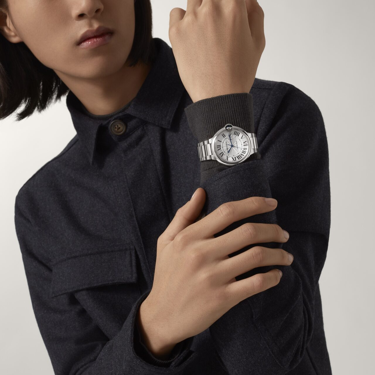 구조적인 케이스와 폴리싱 브레이슬릿을 갖춘 발롱 블루는 지금껏 보지 못한 특별한 분위기를 자아냅니다. 와인딩 크라운의 블루 비즈는 메종의 디자인 코드를 뒤엎는 반면 로마 숫자와 과감한 검 모양의 핸즈는 그 끝을 알 수 없는 품격을 더합니다.